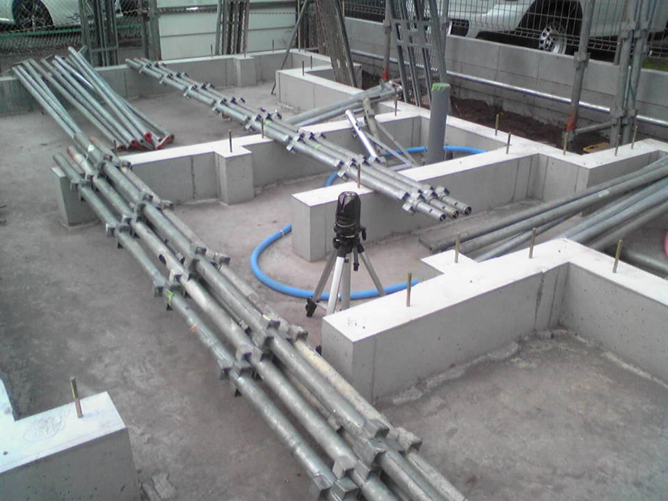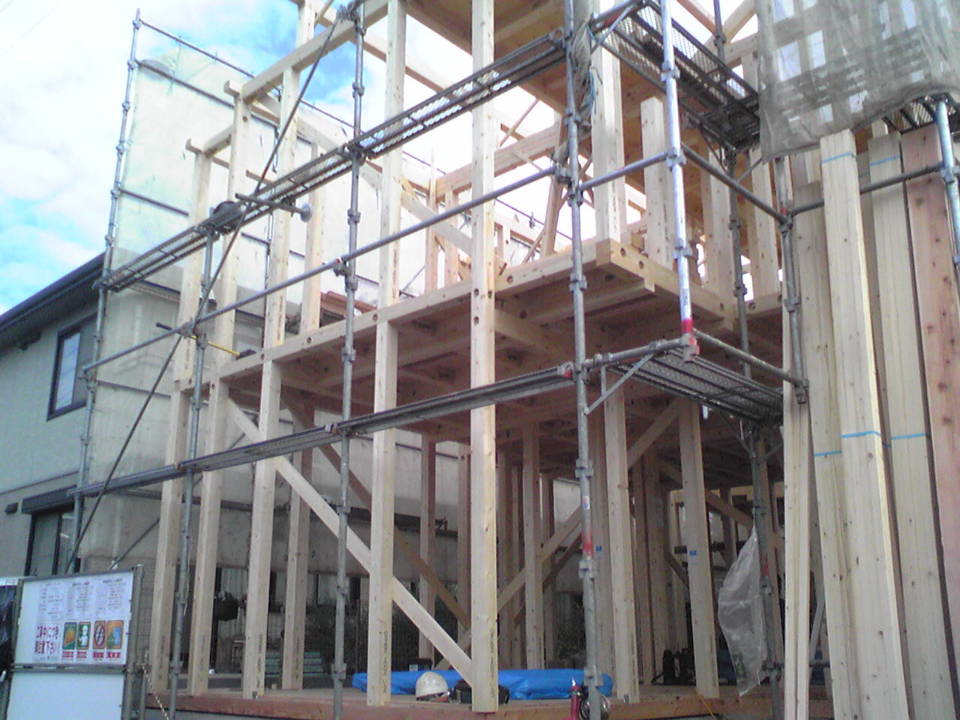 先日、基礎工事が完了し、上棟に先行して足場組み立てを行いました。