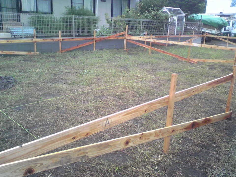 やり方作業とは、工事着手の前に、建物の正確な位置・高さ・水平などを決める作業のことです。ジェネシスでは、複数の現場監督たちでチェックしながら半日強かけて行っています。こちらは作業完了後の写真。