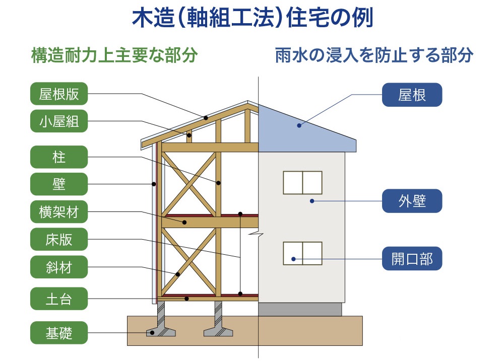 保険の対象となるのは住宅品質確保法に定められた、「構造耐力上主要な部分」および「雨水の浸入を防止する部分」です。
