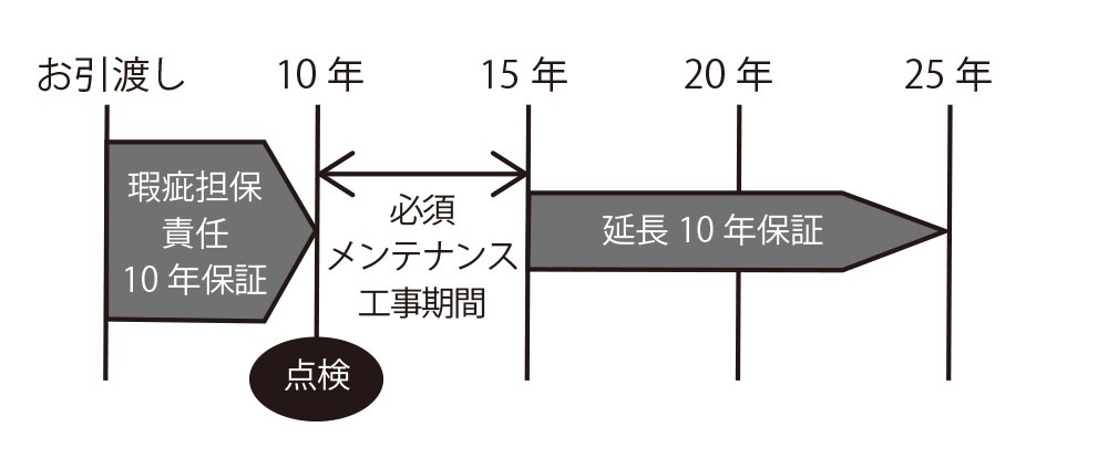 瑕疵担保責任10年に加え、必須メンテナンス工事の完了確認日を始期とし10年間を延長保証します。