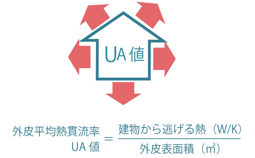 断熱性能(UA 値)って?外皮平均熱貫流率(UA 値)は、住宅の内部から床、外壁、屋根(天井)や開口部などを通過して外部へ逃げる熱量を外皮全体で平均した値です。