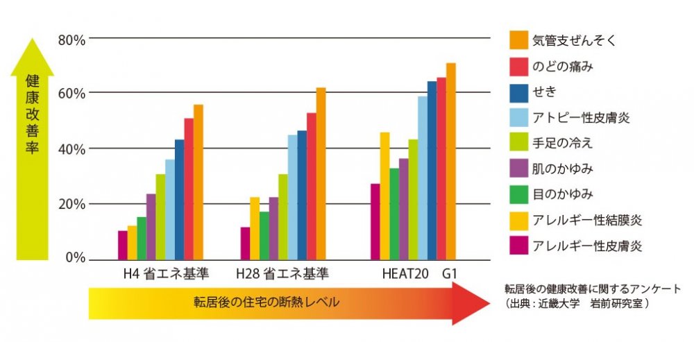 断熱性能の高い家に引っ越しした人の方が、ぜんそく・喉の痛み・アトピー性皮膚炎などの改善率が高いという調査データが報告されています。つまり、住宅の断熱性能を高めることで、同様の健康改善効果が期待できます。