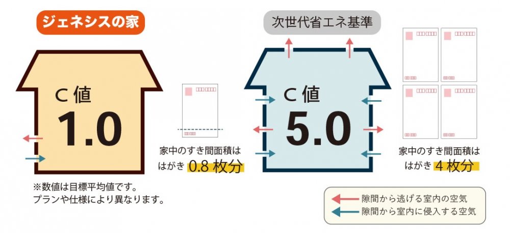 その家のC値=1.0となります。数値が小さいほど優れた気密性をもつ建物といえます。