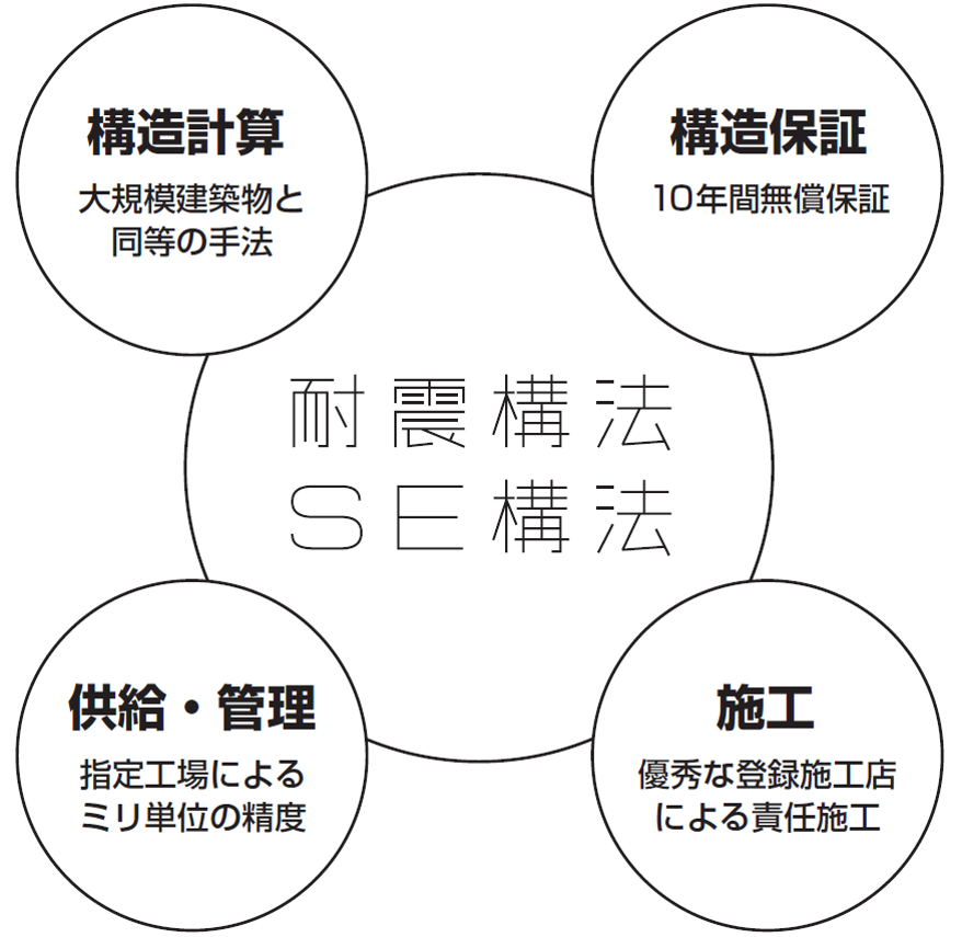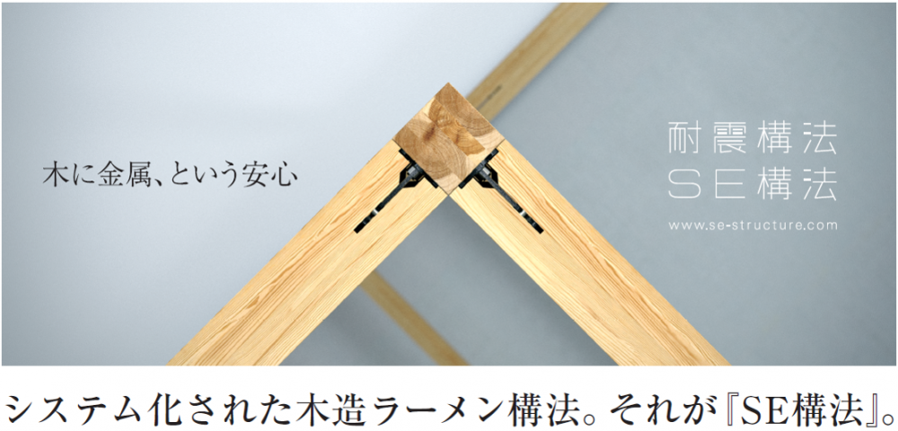 ホーム 性能・構造 2. SE構法 選べる4つの工法②耐震構法 SE構法 選べる4つの工法②耐震構法 SE構法 柱や梁そのものを互いに剛接合し、強固な構造躯体をつくり上げる。従来、鉄骨造やRC 造において主流だったラーメン構法を、日本の木造住宅に取り入れたのがSE構法です。 ラーメン構法は極めて信頼性が高く、歴史的な蓄積も多いことから、20 世紀以降の近代建築の主役ともいうべき役割を果たしています。しかし鉄やコンクリートといった強度計算のできる均質な部材を前提としているため、日本の木造住宅にラーメン構法を取り入れようという発想は、存在しませんでした。 それは地震大国日本において、日本人がもっとも住みたいと願う「木の家」に、必要な耐震性を確保する構法が存在しないことを意味していました。 耐震構法SE 構法が実現したのは、住む人の安心と安全。地震に負けない強さと、木造の美しさの両立だったのです。 構造部材として強靭な集成材を使用 高い耐久性を持つ独自のSE金物 コンピューター制御による高精度プレカットで加工されるエンジニアリングウッド(JAS 構造用集成材)を採用。天然木材の長所をそのままに、反り、ねじれ、割れ、伸縮などの欠点を克服し、飛躍的な強度を実現。しかも安定した品質が構造計算を可能にし、大規模構造建築物をも可能にします。 SE金物はエンジニアリングウッドの特長を引き出すと共に、他の金物では実現できない強度を確保。同時に柱梁の断面欠損が起きにくく、構造的にも高い安全性を誇ります。だからこそ、1 階部の大開口やビルトインガレージの設置といった、高い強度を要求されるプランでも対応可能なのです。 立体解析による構造計算 自由で開放的な間取りを実現 SE 構法は、木造住宅においても大規模建築と同様の応力解析による構造計算を実施しています。CAD と連動した立体応力解析であらゆる安全性を点検。もちろん様々なデータをもとに、コンピュータ上で、台風、地震、積雪などの自然災害についてもシミュレーションし、その安全性を確認しています。 開口部いっぱいの窓で明るく開放的な設計が可能。また、耐力壁による空間の遮断がなく、自由な間取りやスペースの有効活用をご提案いたします。従来では考えられなかったワンフロアをワンルームとし、暮らし方の可能性を大きく広げる大空間設計を実現しています。 SE住宅性能保証 性能報告書 「SE 構法」は、表示可能な性能を持った集成材や金物と、それらによって組立られた住宅の性能をコンピュータによるシュミレーションで算出・表示する事ができ、また施工については、登録施工店のSE 構法施工管理技士が個別管理しますので、施主と施工業者の間で合意した駆体の性能値が確実に実現できる体制となっています。 SE 構法は、それぞれ1軒1軒の構造性能を表示することができるので、 規定の構造検査に合格した物件に対してSE 構法性能報告書を提出しています。この中では、建物の層間変形角や偏心率、剛性率といった、一般木造住宅ではあまり表示されることのない構造性能も明記しております。 耐震構法SE構法の強さの秘密を、印象的なビジュアルで分かりやすく85秒にまとめました。 ≪SE構法 施工事例≫完成写真は画像をクリック!