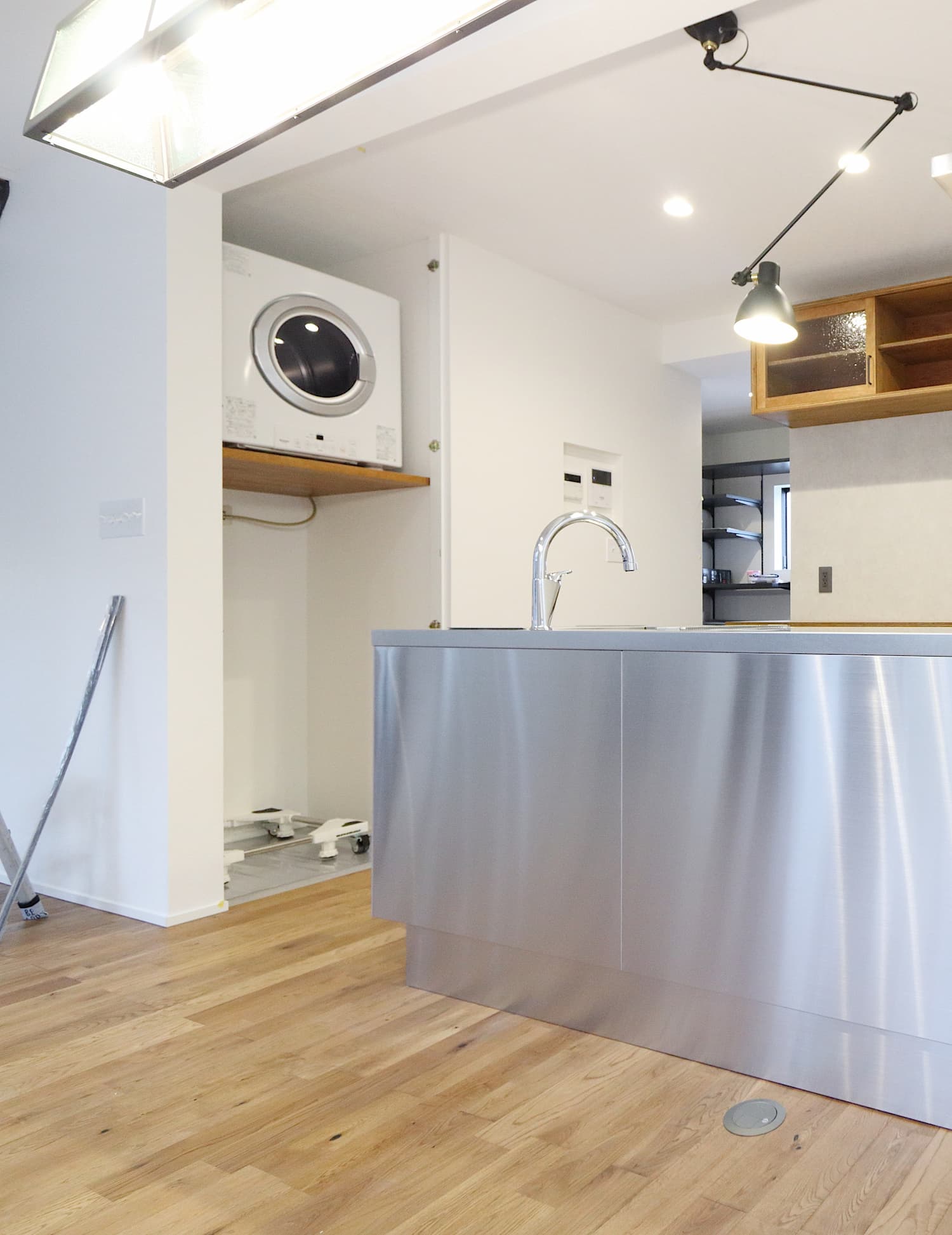 ホーム 施工事例 テイスト別 インダストリアル Brooklyn style house Brooklyn style house 羽村市の家 I様邸 テイスト別|インダストリアル 黒をベースにした外観。 某有名カフェチェーンでも採用されている屋根材をアクセントに使用しました。画像のみを表示全 19 枚中 1 枚目を表示Next ≫ モノトーンでスタイリッシュにまとめられた玄関ホール。タイルと建具は黒で統一しシャープな印象に。 タイル:名古屋モザイク ミニマルスマート600角画像のみを表示全 19 枚中 2 枚目を表示≪ Prev|Next ≫ ブルックリンスタイルらしいトグルスイッチを採用。切り替え時にパチリと金属ながら確かな手ごたえが感じられるスイッチプレートです。画像のみを表示全 19 枚中 3 枚目を表示≪ Prev|Next ≫ 建具は枠のないスッキリとしたデザインのものを採用。ホール全体はモルタル調の壁紙で仕上げています。 階段の蹴込板も黒にしているのもお施主様のこだわりポイント。画像のみを表示全 19 枚中 4 枚目を表示≪ Prev|Next ≫ 1階には将来仕切れる居室が2部屋。現在は仕切りを設けず、ご家族の寝室として利用中との事。画像のみを表示全 19 枚中 5 枚目を表示≪ Prev|Next ≫ ウォークインクローゼット内部。お施主様がこだわっての選び抜いた黒のレザー調のクロス(FE-6446)で空間にメリハリを持たせました。画像のみを表示全 19 枚中 6 枚目を表示≪ Prev|Next ≫ 1階トイレはマテリアルな質感が際立つコンクリート調の壁紙と床材でコーディネート。 クロス:シンコール BB1373画像のみを表示全 19 枚中 7 枚目を表示≪ Prev|Next ≫ 南側を吹き抜けにすることで光をたっぷり取り入れたLDK。日中は照明いらずで過ごせているとの事。 TV上部にはスクリーンを埋め込んであり、スイッチひとつでリビングがホームシアターに早変わりできる仕様。 画像のみを表示全 19 枚中 8 枚目を表示≪ Prev|Next ≫ 趣味の映画鑑賞を楽しめるよう天井にはプロジェクターを設置。 床は無垢材ならではのやわらかな質感とアンティーク感がお気に入りというオーク材を採用。 生活感を出さないよう、キッチン横には洗濯機と乾燥機収納を設けました。 画像のみを表示全 19 枚中 9 枚目を表示≪ Prev|Next ≫ ステンレスのスタイリッシュなキッチンをご希望との事で、サンワカンパニーのグラッド45を採用。 床はフロアタイル(MBE-165)でさりげなくゾーニング。木の質感がすてきな背面収納はお施主の特注品。画像のみを表示全 19 枚中 10 枚目を表示≪ Prev|Next ≫ キッチンの床はフロアタイル(MBE-165)を使用し、リビングとさりげなくゾーニング。フルオープンの食洗機はガゲナウ製。画像のみを表示全 19 枚中 11 枚目を表示≪ Prev|Next ≫ 階段横はお子様たちのスタディスペースに。画像のみを表示全 19 枚中 12 枚目を表示≪ Prev|Next ≫ 2面に吹抜けがあり、階下のLDKとつながりを持つ小屋裏収納。モルタル調のクロスで「こもり感」「秘密基地」のような雰囲気に仕上げました。画像のみを表示全 19 枚中 13 枚目を表示≪ Prev|Next ≫ 書斎の扉も古木のものをチョイス。アイアンの取っ手やラフな質感がポイント。 参考URL:オーダー家具店「SQUARE」 室内側もトランク取っ手、丸落としタイプ、アメリカンスイッチでインダストリアルに。 画像のみを表示全 19 枚中 14 枚目を表示≪ Prev|Next ≫ アンティーク感のある古びた足場板をアクセントに使用。テレビ会議の際の背景に古木が映りこむお洒落な空間を目指しました。 照明はお施主様の支給品。 画像のみを表示全 19 枚中 15 枚目を表示≪ Prev|Next ≫ ブルックリン調の雰囲気を出したかったため、モルタルと古材を用いた洗面室にしました。鏡もオーダー家具店からのこだわりようです。画像のみを表示全 19 枚中 16 枚目を表示≪ Prev|Next ≫ トイレはシンプルに。古材の棚とアイアンのペーパーホルダーをアクセントにしています。画像のみを表示全 19 枚中 17 枚目を表示≪ Prev|Next ≫ LDKからスケルトン階段をあがるとルーフバルコニーへつながります。画像のみを表示全 19 枚中 18 枚目を表示≪ Prev|Next ≫ 階段を昇った先にあるルーフバルコニー。眺めは絶景です。画像のみを表示全 19 枚中 19 枚目を表示≪ Prev 工 法:木造軸組構法 延床面積:88.57㎡(26.79坪) 本体価格:1,600万円 別途費用: 600万円 設計費用: 80万円 外構費用: 80万円 合計価格:2,360万円 ※表示は全て税込です。 こちらのお住まいが完成するまでの建築レポートはこちら ▽▼もっと事例が見たい方におすすめ▽▼ ホームページには公開されていない写真や間取りを多数掲載!実例集や家づくりについての小冊子、ニュースレターなどがセットになった人気のカタログセット無料プレゼント実施中♪ ▼▼無理な勧誘は行っておりません。お気軽にご参加ください▼▼ ▼▼大好評!オンライン相談も受付中▼▼ 一覧へ戻る 全ての写真 タイプ別 広さ別(延床面積) パーツ別 テイスト別 SUUMO掲載中 すべて SE構法 狭小地・変形地に建てた家 2階建て 3階建て 東京ゼロエミ住宅 二世帯・共同住宅 リフォーム・リノベーショ