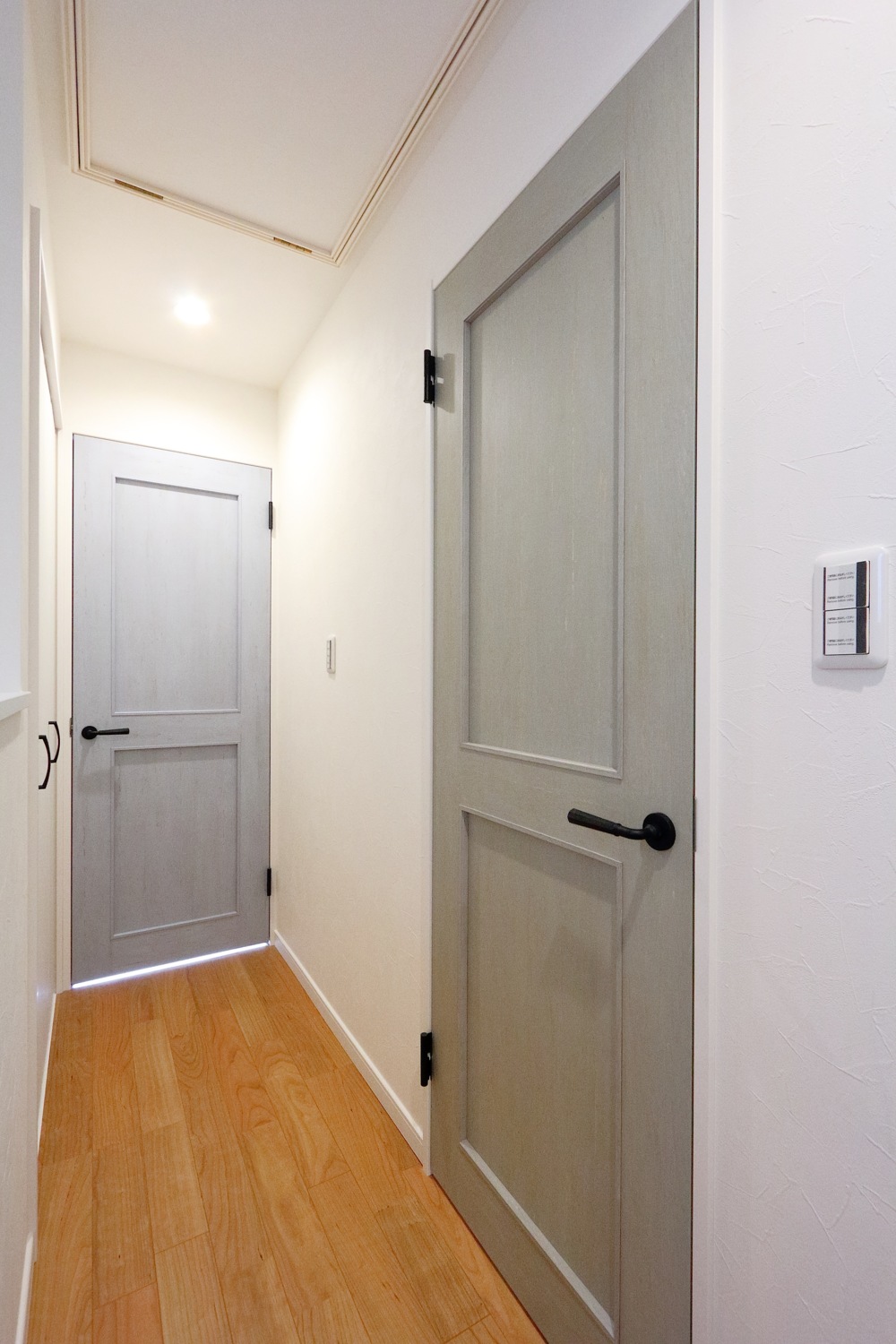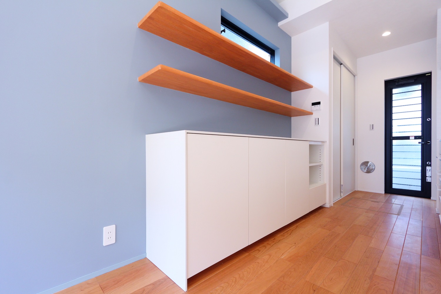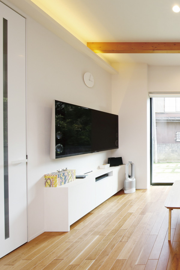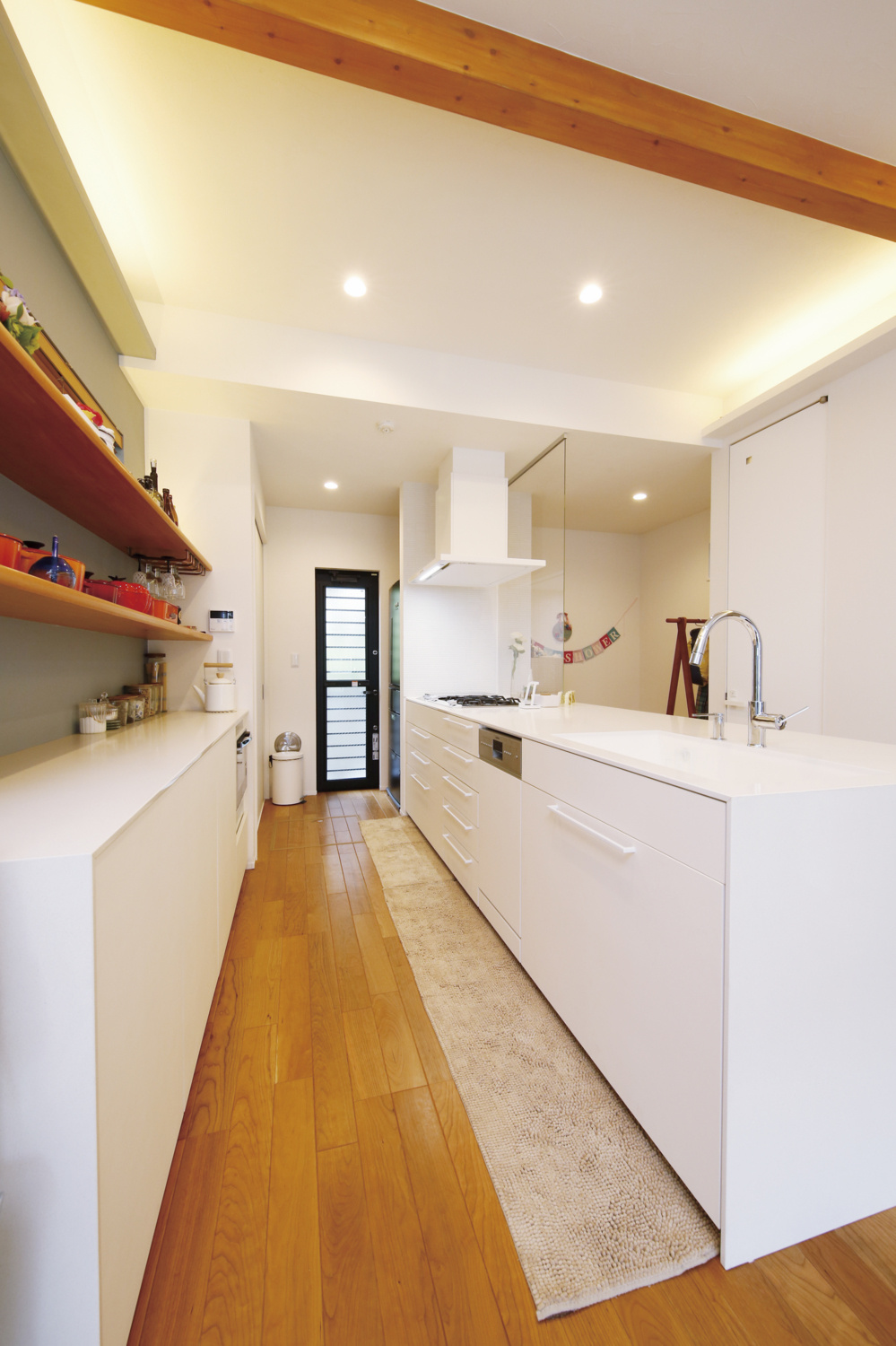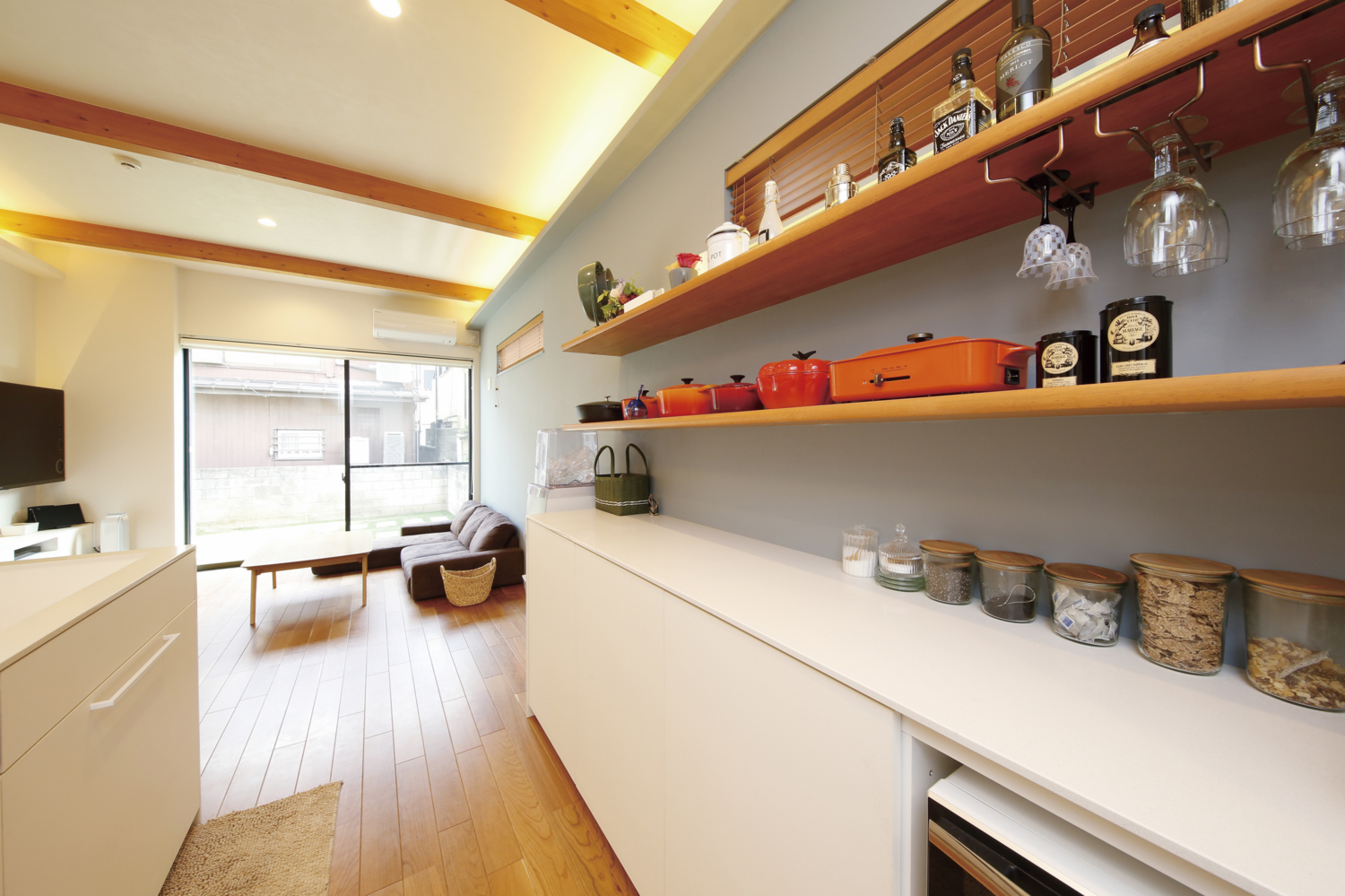 オリジナル家具と白のキッチンが映える高天井リビングの家