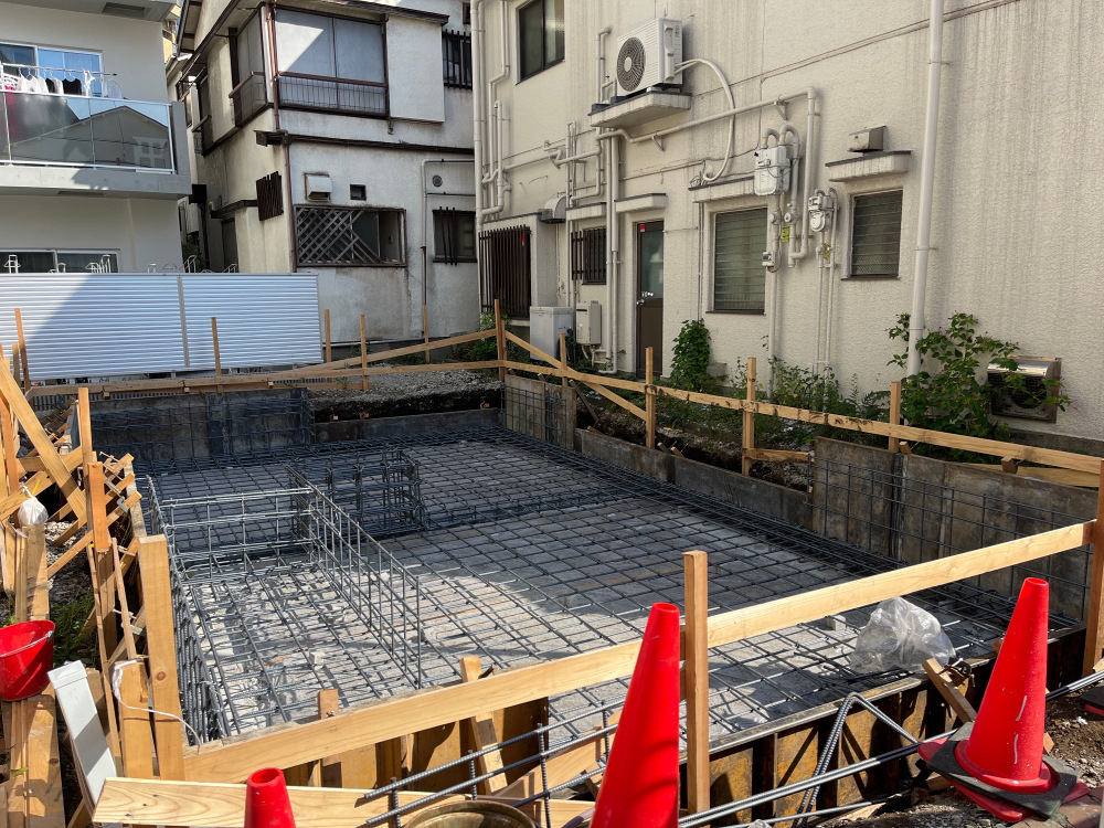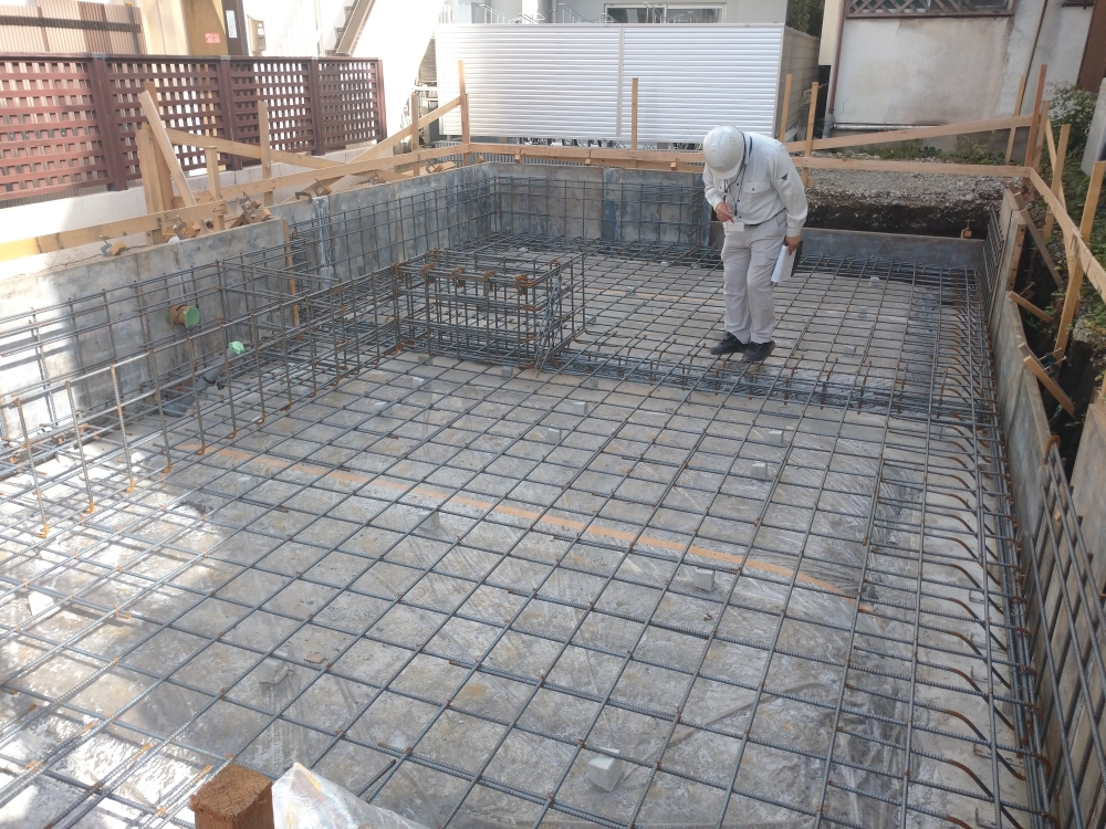 基礎の図面通りに鉄筋を配列させることを配筋といい、全て完了した時点で、自社チェック・第三者機関による配筋検査を受けます。