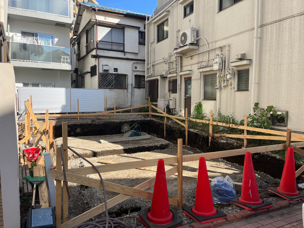 根伐り作業にて地盤を掘り進めた後に砕石を敷きこみ転圧をしていきます。