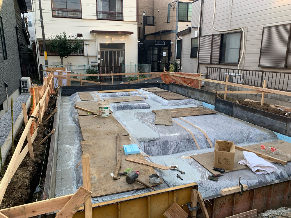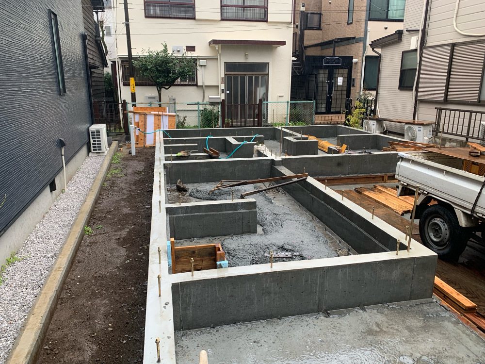 この部分のコンクリートの養生を待ち、今度は立ち上がり部分の生コン打設のための枠組みに移行します。