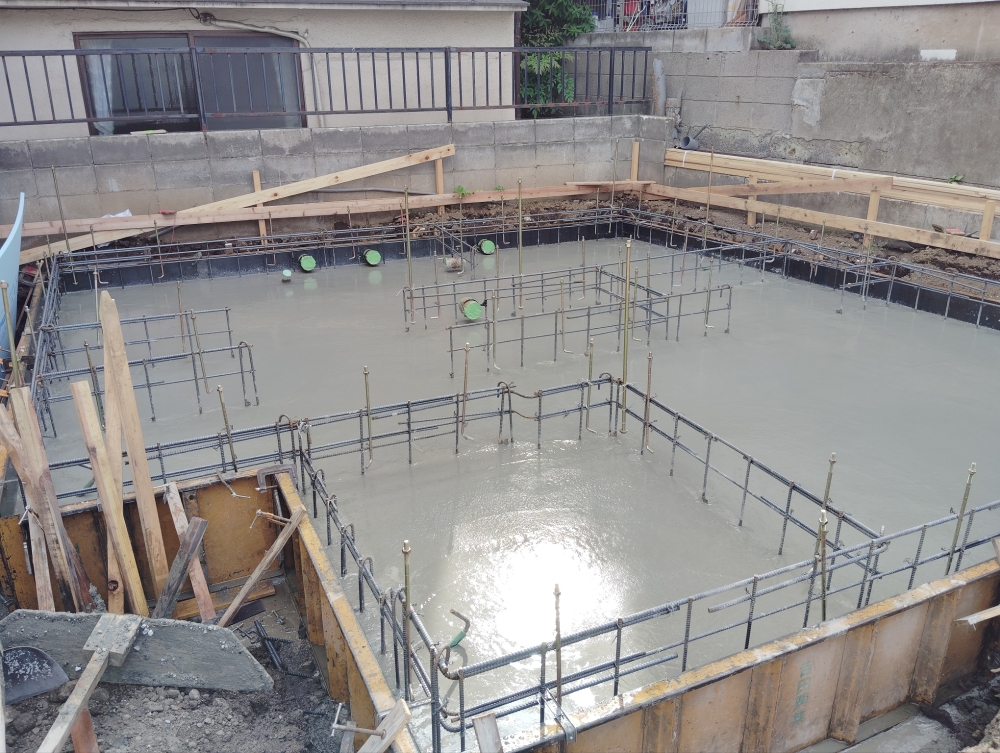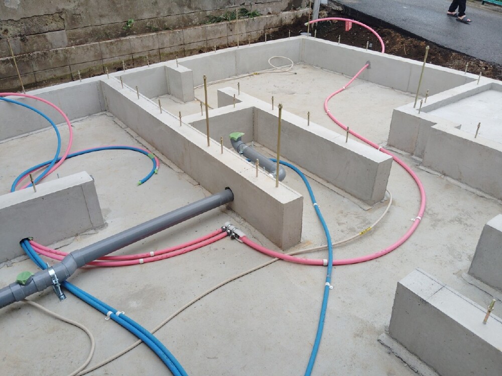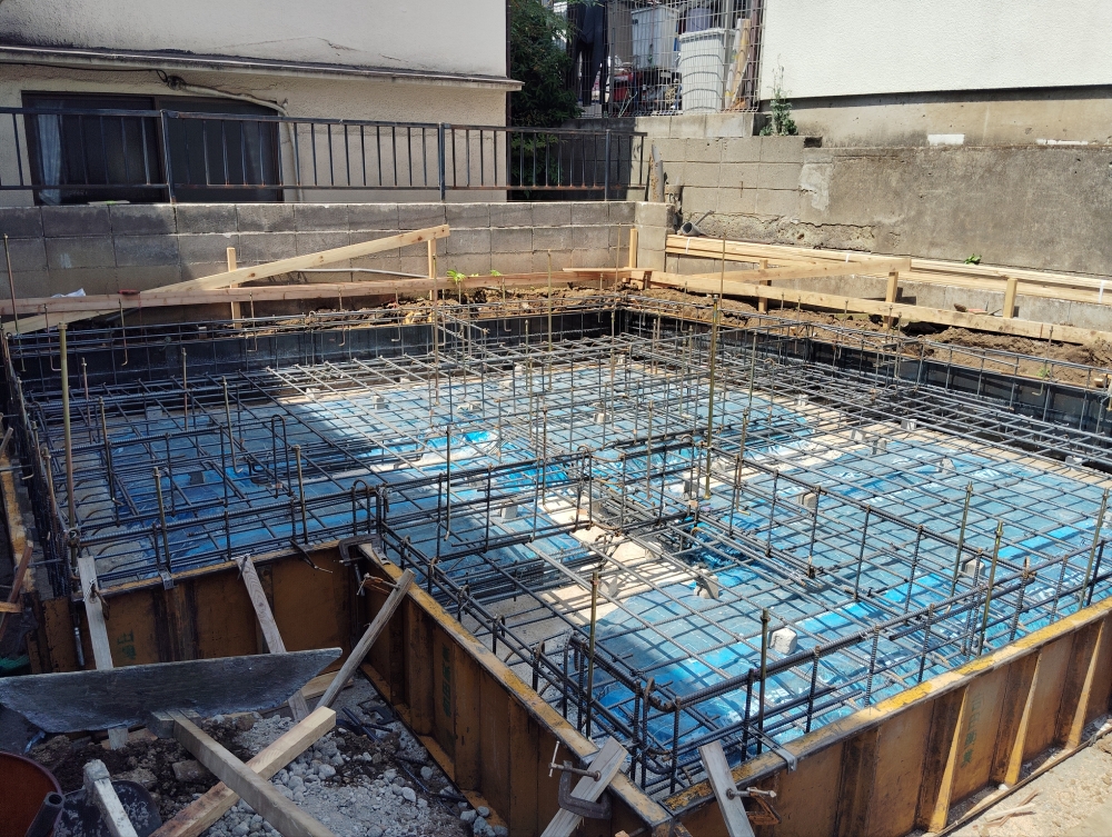 基礎の図面通りに鉄筋を配列させることを配筋といい、全て完了した時点で、自社チェック・第三者機関による配筋検査を受けます。