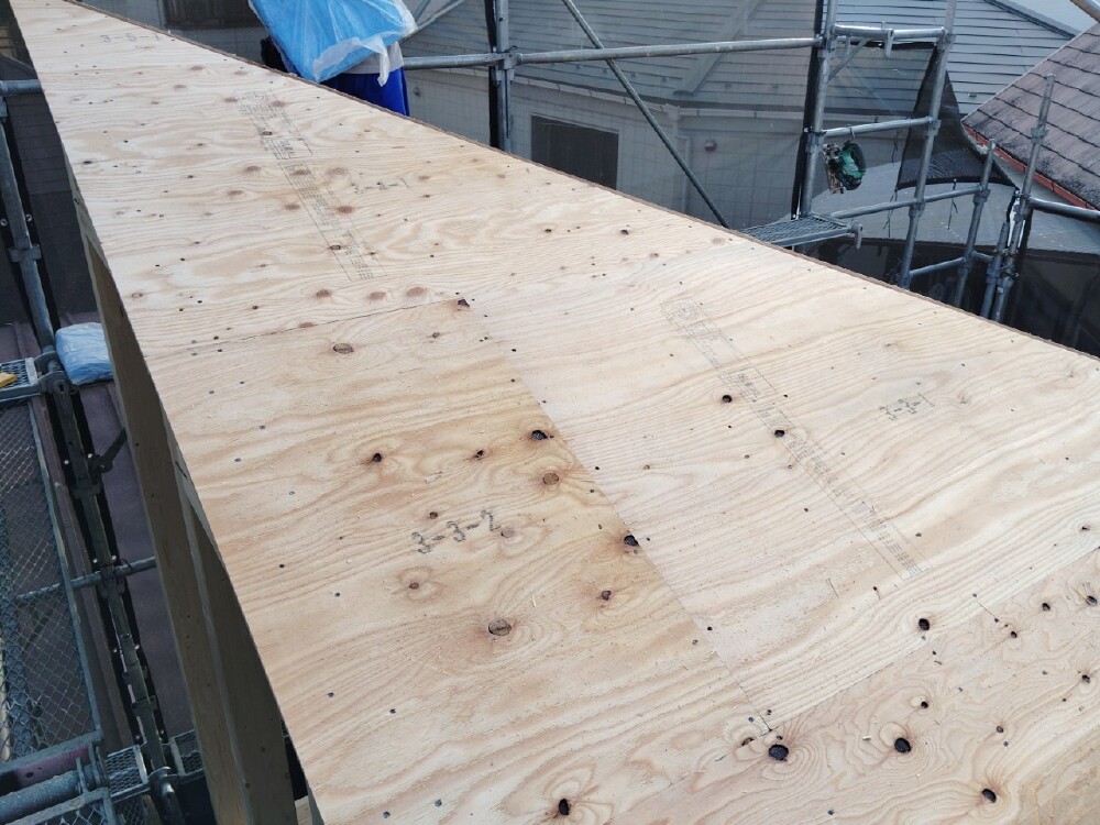 屋根の構造は、下から一般的に野地板→ルーフィング→メイン屋根材の順に仕上がります。