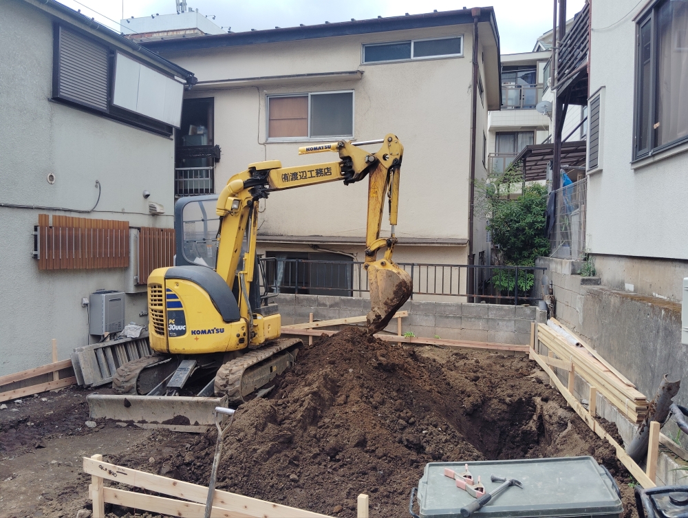 根伐りとは、基礎の形状、高さなどを考慮しで重機で地盤を掘り進める作業です。
