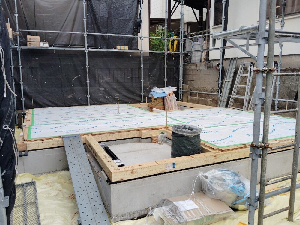 土台を敷き床パネルまで施工し上棟前の準備になります。