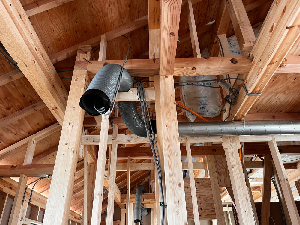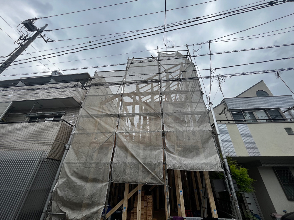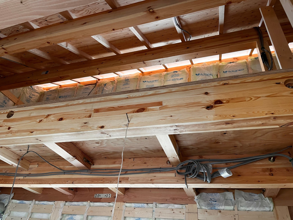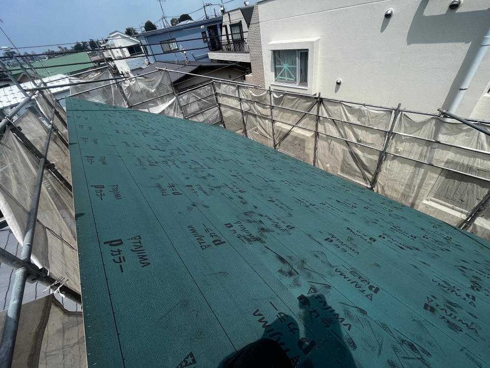 上棟後、大工さんが屋根下地(垂木・野地板)施工しルーフィング敷きを行います。