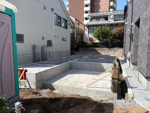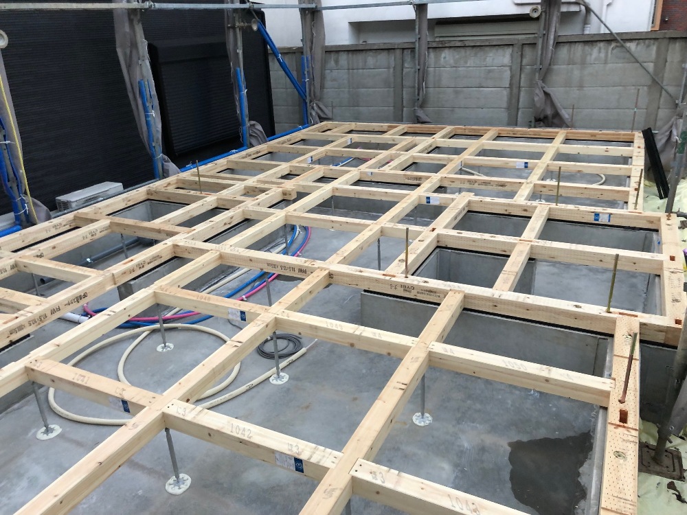 土台敷きとは、基礎コンクリートの上に土台や大引を設置していく作業です。この土台敷きやこのあとの構造部分は住宅の骨組みとなる大変大事な工程になります。