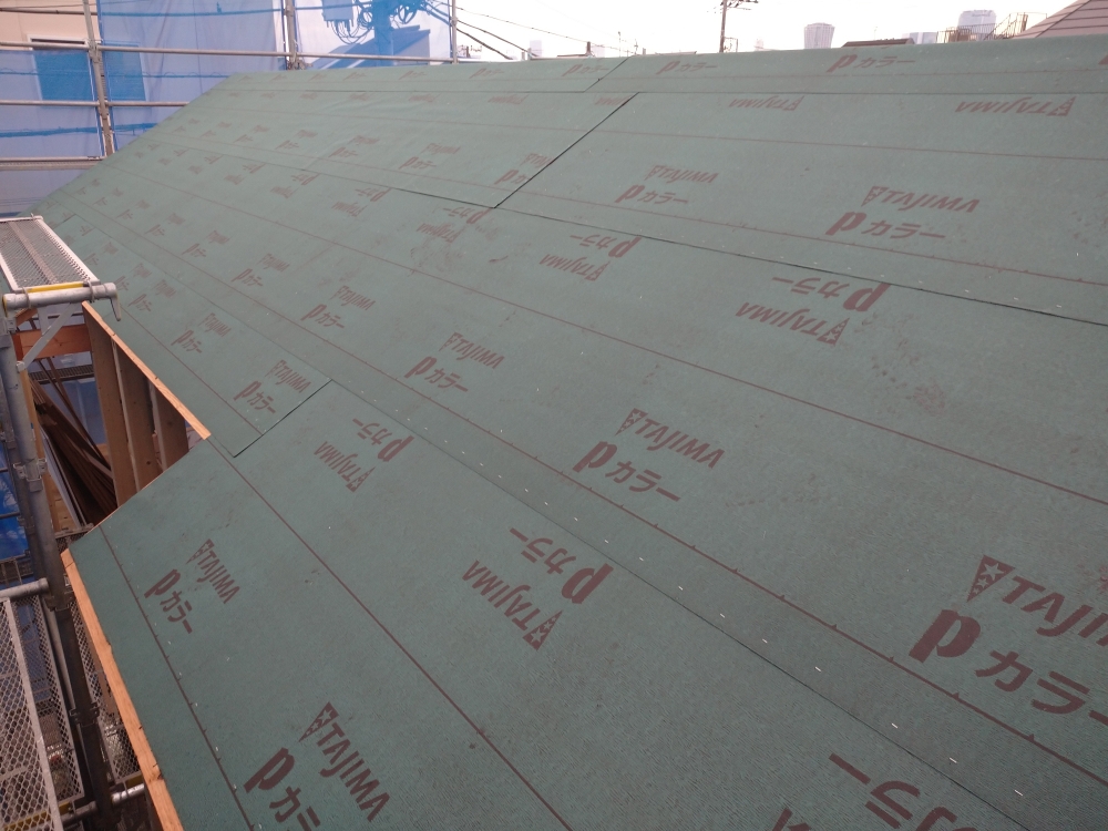 ルーフィングとは屋根の下地材(構造用ベニヤ)を施工した上に張り広げる防水シートのようなものです。