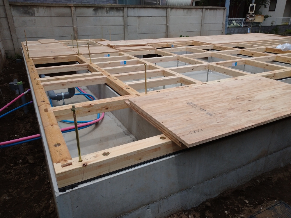 基礎工事が完了し木工事の最初となる土台敷きを行いました。