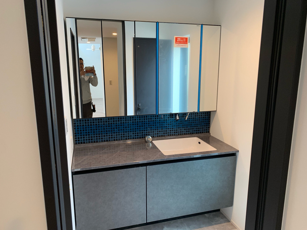 クロス工事も完了し、洗面化粧台を設置いたしました。