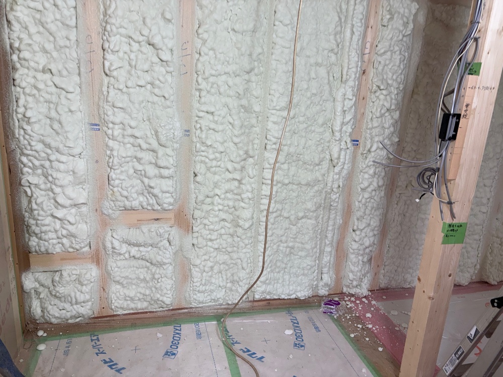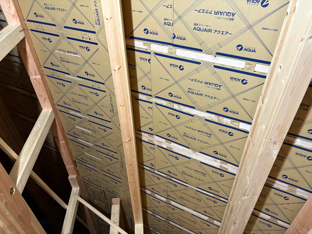 本日、ウレタン吹付断熱なので屋根の通気層を確保するためにアクエアーを施工しました。
