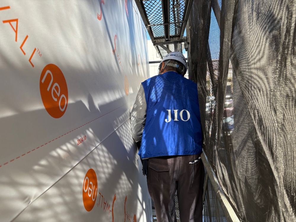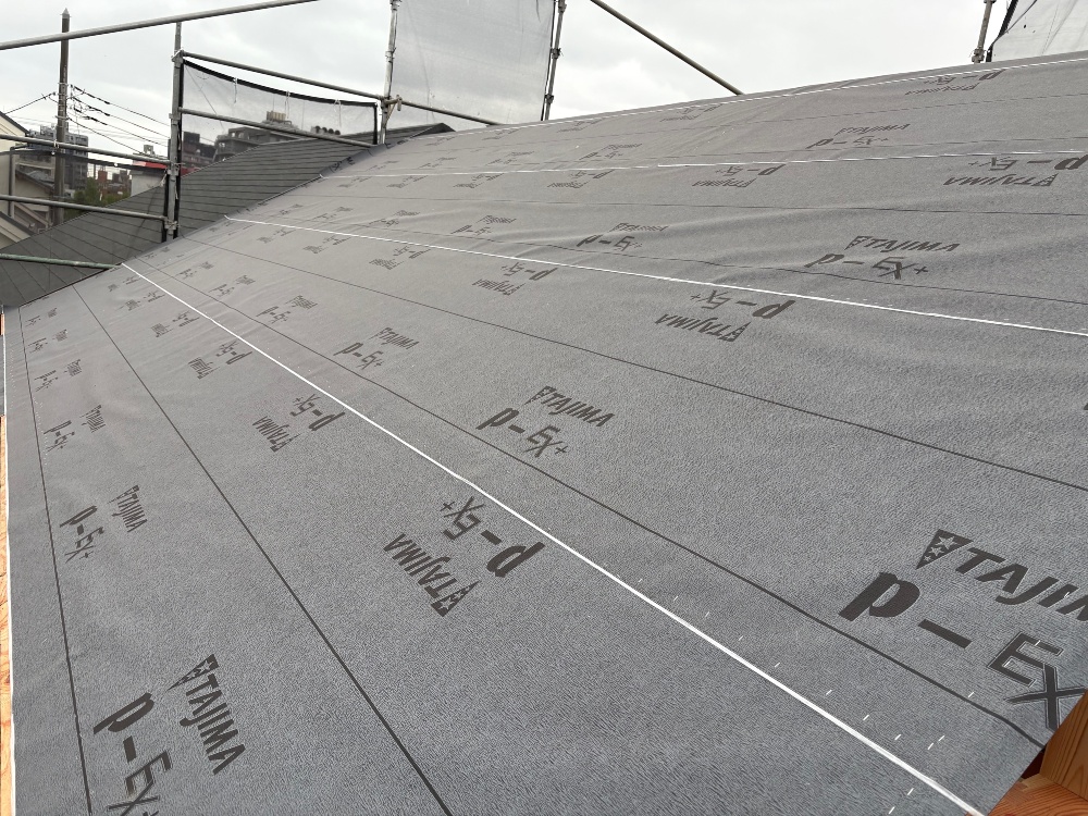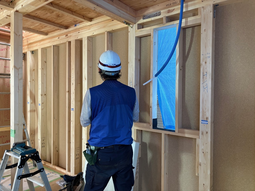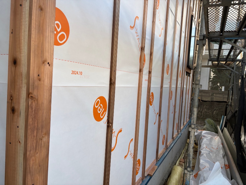 防水紙の重なりしろや貫通部のテープ処理がしっかりされているかを確認してもらいます。