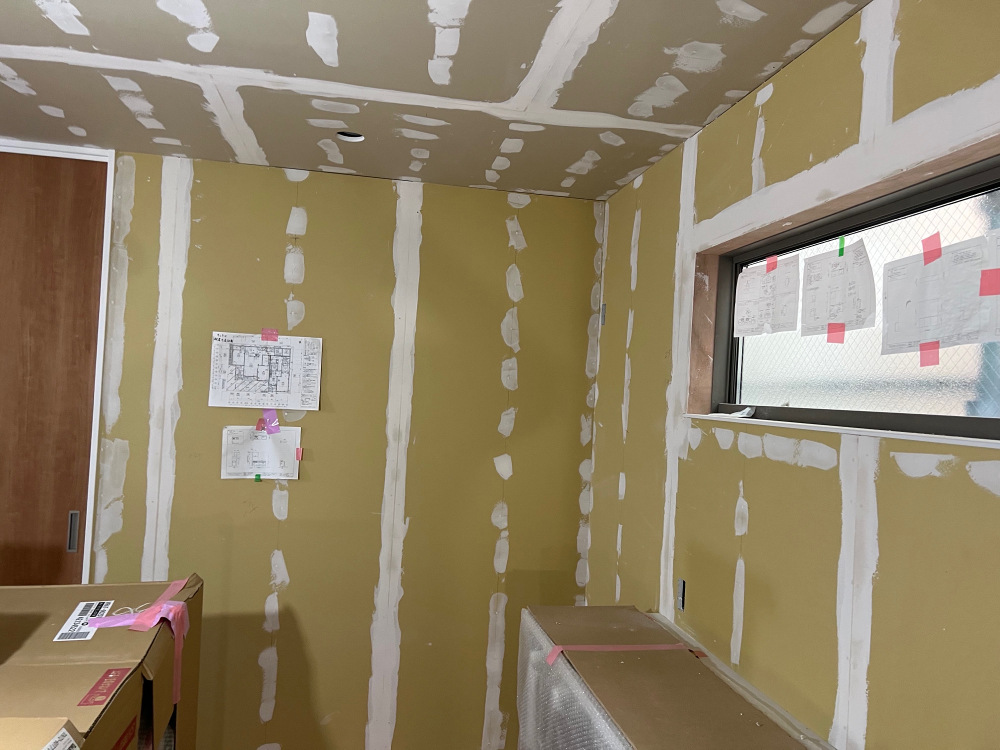 クロスを張る前処理としてボードの継ぎ目やビスのところへパテ処理をし平にする作業を行っています。