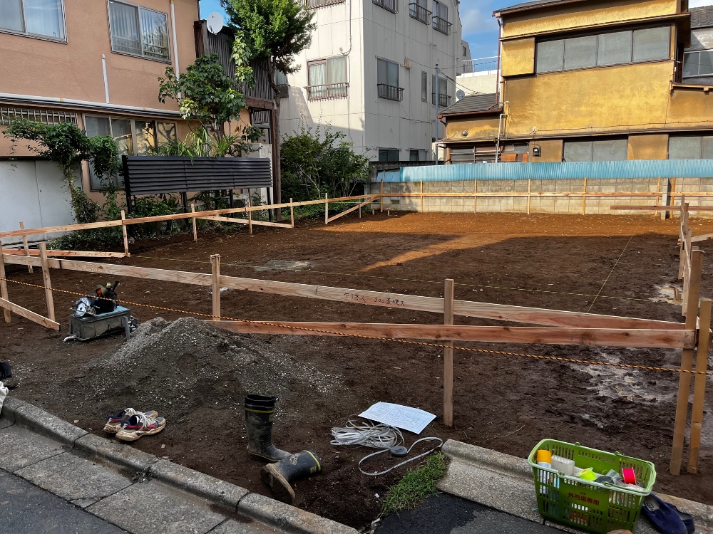基礎工事の前に、柱や壁などの中心線や水平線を設定するため、杭を打ってつくる仮設物のことで、 実際の建築物の位置・高さ・水平の基準となる重要な工程です。