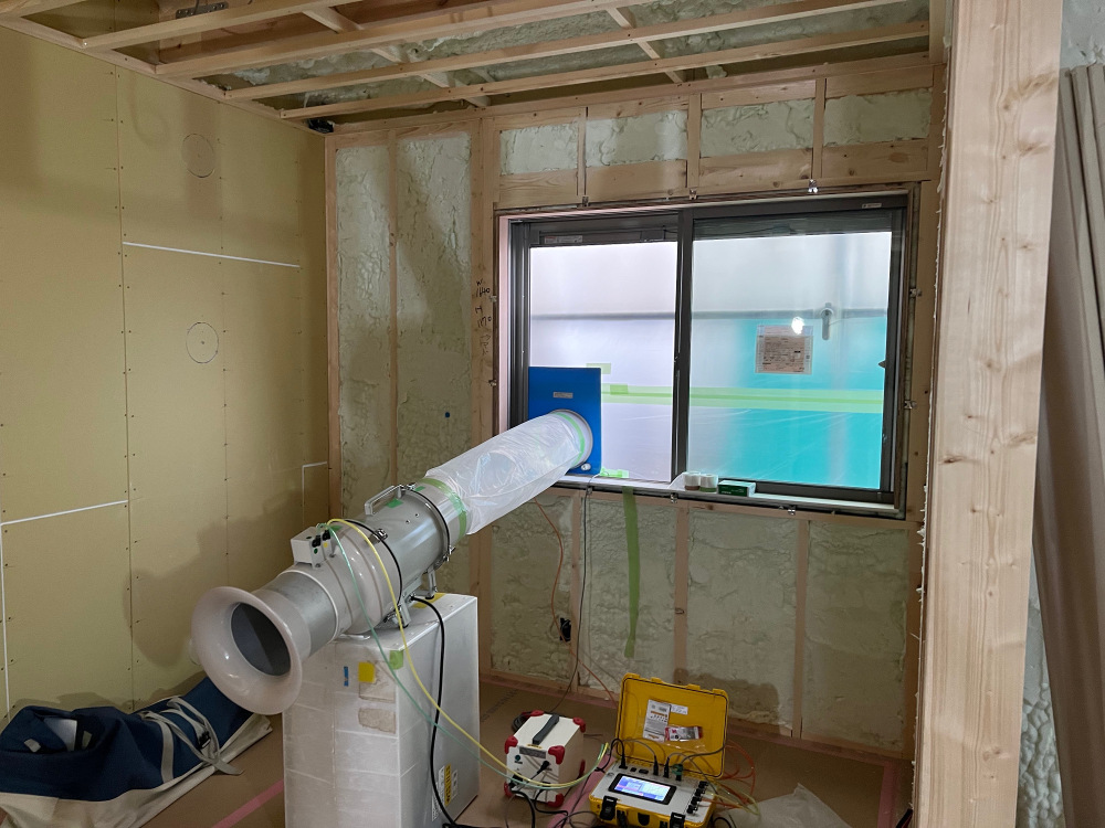 特殊な計測器で家全体の隙間を計測します。C値:0.4c㎡/㎡と高気密に施工できていました。