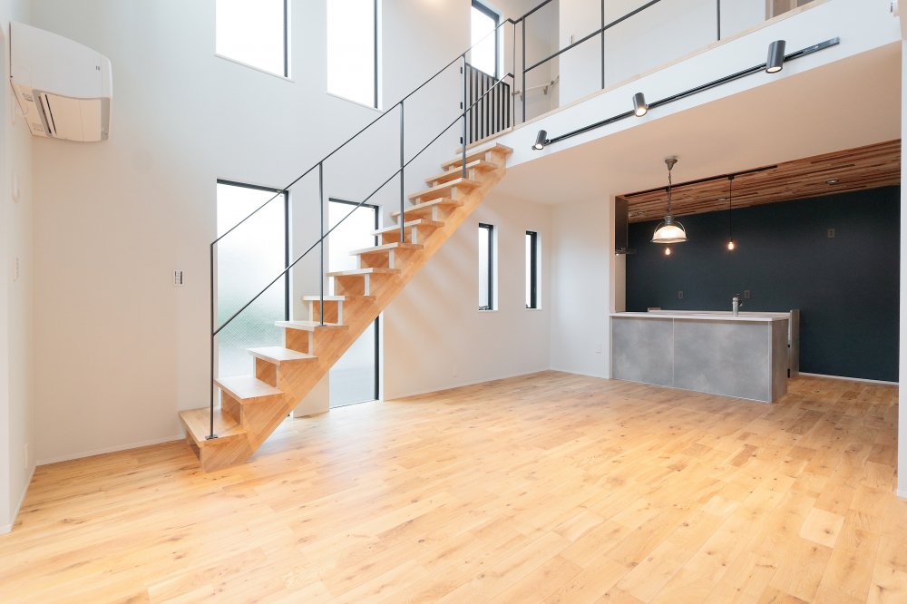 大きい吹き抜けとスケルトン階段、大きい窓。