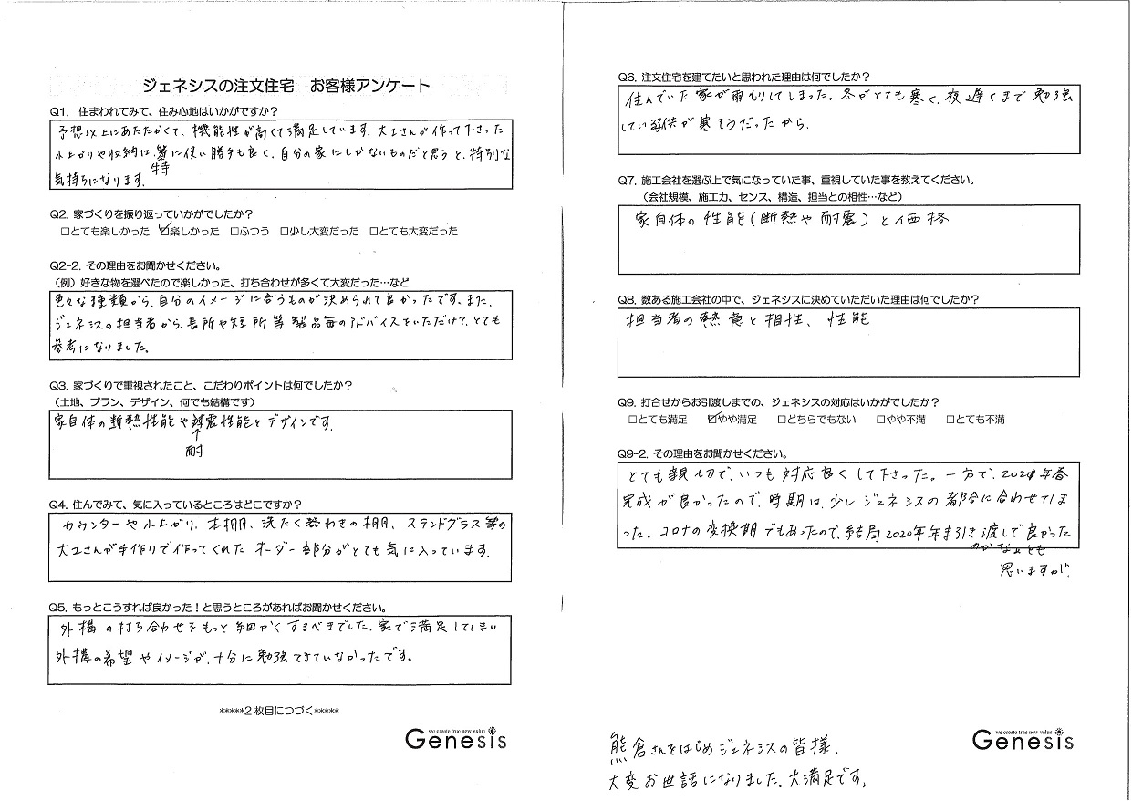 とても親切で、いつも対応良くして下さった。一方で2021年春完成が良かったので、時期はジェネシスの都合に合わせてしまった。コロナの変換期でもあったので、結局2020年年末引渡しで良かったのかなとも思いますが。